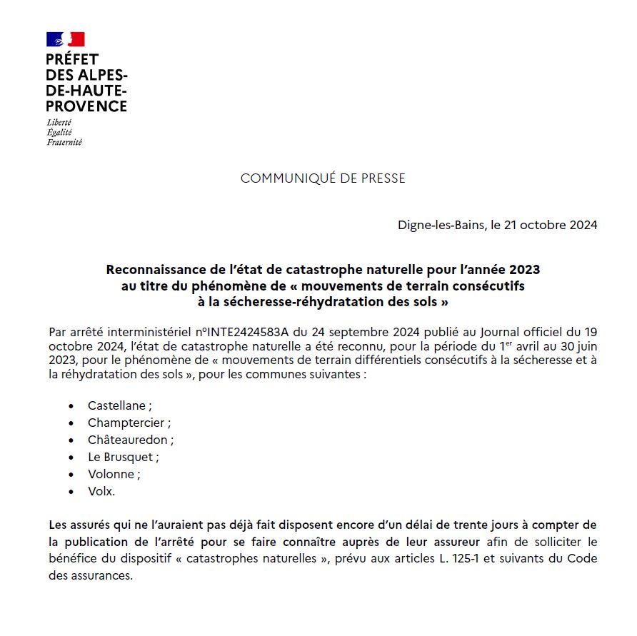Par arrêté interministériel du 24 septembre 2024, publié au Journal Officiel le 19 octobre 2024, l’état de catastrophe naturelle a été retenue pour le phénomène de « mouvements de terrains différentiels consécutifs à la sècheresse et à la réhydratation des sols, période avril à juin 2023, pour la commune de Castellane.