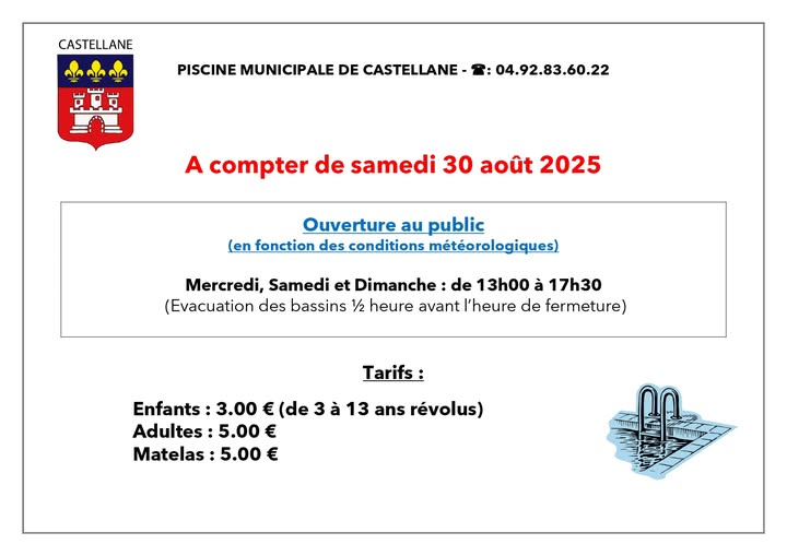 A compter du samedi 30 août, la piscine sera ouverte au public de 13h à 17h30 le mercredi, samedi et dimanche.