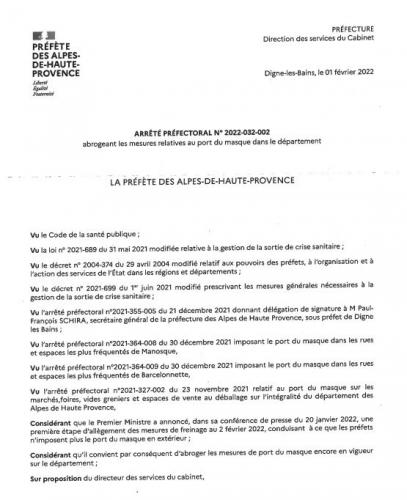 Il est rappelé que les mesures relatives au port du masque relèvent désormais uniquement des mesures nationales du décret du 1er juin 2021.