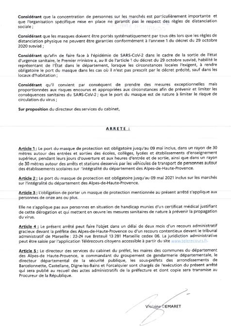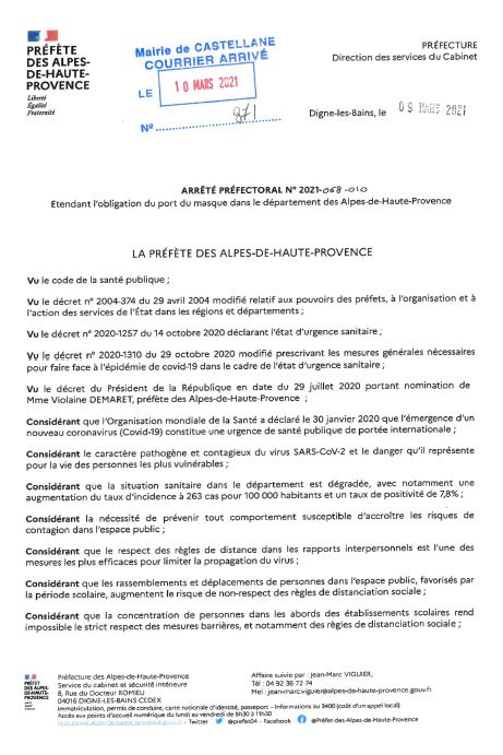 Depuis le 10 mars 2021, l’arrêté préfectoral concernant le port du masque dans tout le centre-bourg de Castellane a été modifié. Dorénavant, il ne sera obligatoire qu’aux abords des écoles (30 mètres) et sur les marchés des mercredis et samedis matin.