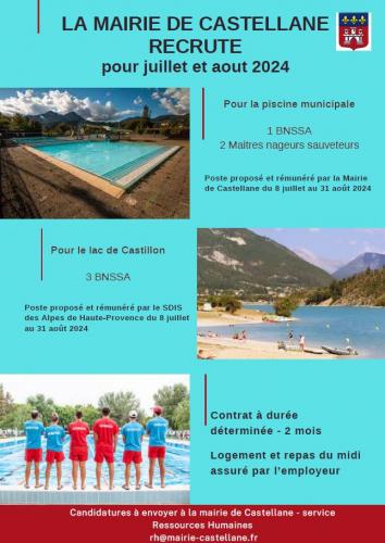 - 1 BNSSA et 2 maîtres nageurs sauveteurs pour la piscine municipale