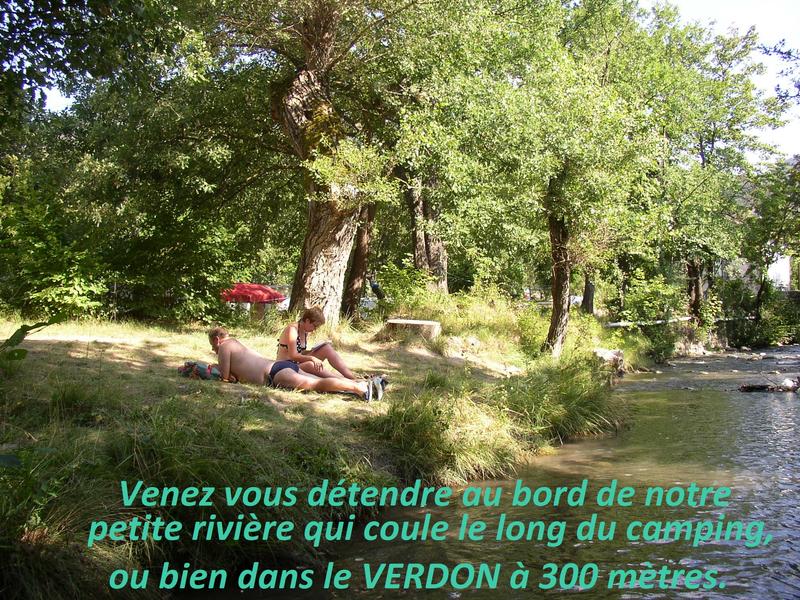 Petit camping familial, calme, plat et ombragé, vous êtes à seulement 600 m du centre du village, sur la route des Gorges du Verdon, en bordure d'un ruisseau et à 300 m du Verdon, lacs à 3 et 5 km, aire de service pour camping-cars à votre disposition.