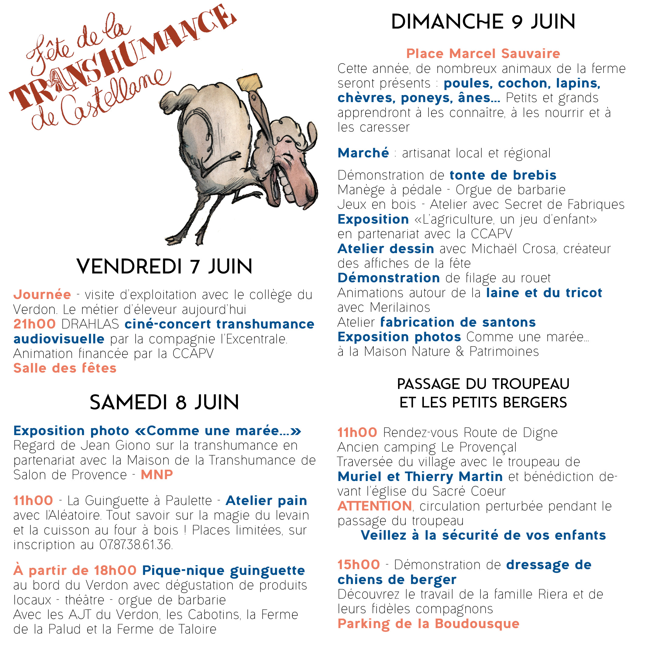 La fête de la Transhumance met en lumière les métiers liés à l’élevage ovin, tonte, filage de laine, dressage de chien berger, berger et bien sûr la tradition de la transhumance, c’est-à-dire le passage des troupeaux dans le village qui montent en estive (passer l’été en montagne pour l’herbe). Et aussi des conférences, un grand marché paysan, un concert, des expositions,…